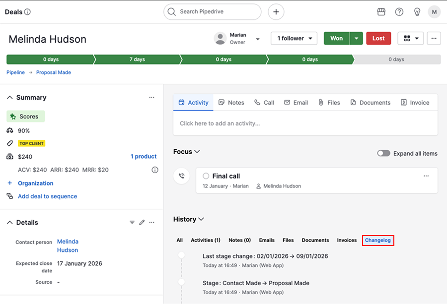 Open the item’s detail view and go to History > Changelog to confirm changes.