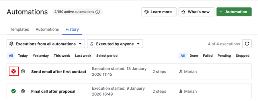 To check what went wrong, select the automation from the list. Click on the action step that failed to view the error message.