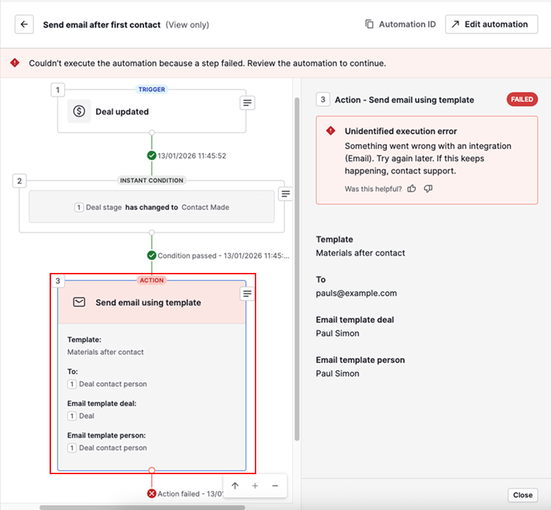 In the example above, the automation failed to send an email, and the error suggests that you review your email sync settings.