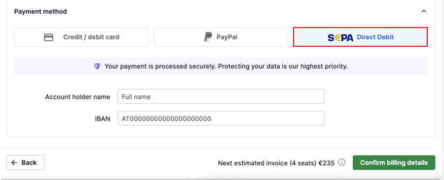 To use a credit or debit card, select credit/debit card, enter your billing details and click “Confirm billing details” to complete the setup.