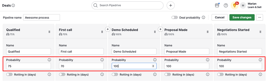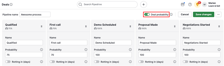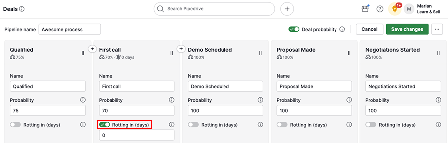 Enable the rotting feature to highlight deals that stay in a stage for too long.