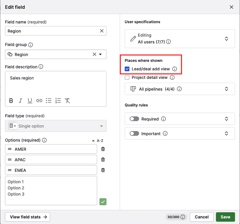 Irányítsa csapatát a kötelező vagy fontos mezők kitöltésére. A mezők kötelezővé tétele megakadályozza az üzlet mentését, amíg a kulcsfontosságú adatok hiányoznak. A fontos mezők használata kiemeli a hiányzó adatokat az üzlet részletnézetében anélkül, hogy megakadályozná a mentést. |