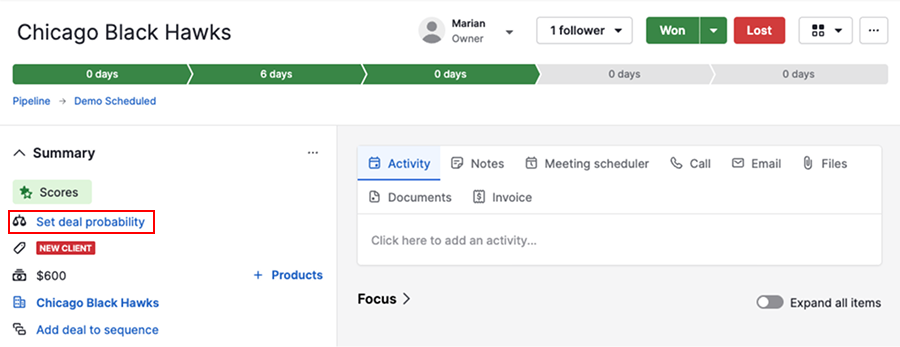 Vai alla visualizzazione dei dettagli dell'affare e seleziona “Imposta la probabilità dell'affare” dal gruppo riepilogo nella barra laterale sinistra.
