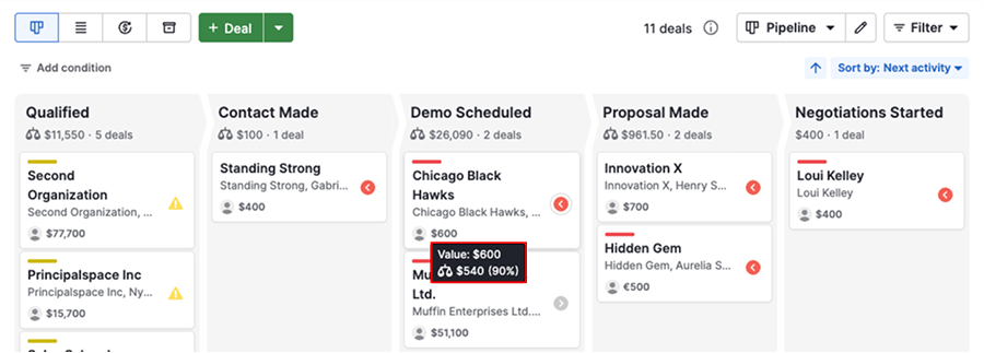 Passa il cursore sul valore dell'affare nella pipeline per visualizzare la probabilità dell'affare e il valore ponderato.
