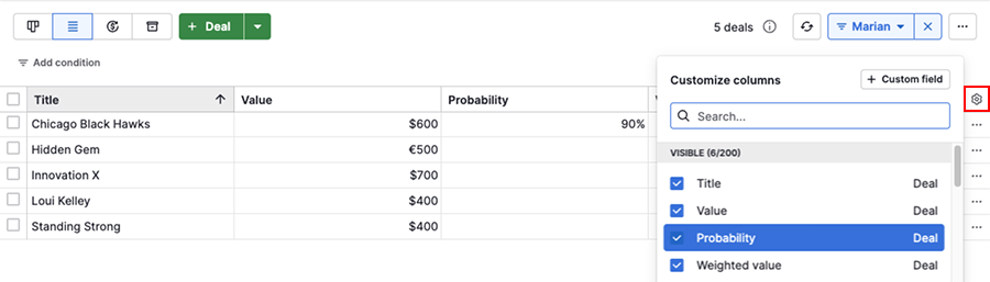 Fai clic sull'icona a forma di ingranaggio e aggiungi la colonna “Probabilità” alla tua vista elenco.