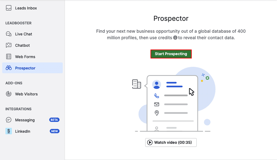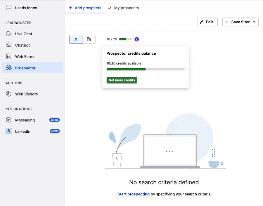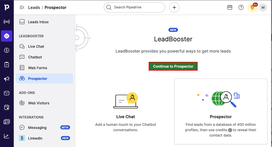 시작하려면 Leads > Prospector로 이동한 다음 “Continue to Prospector”를 클릭하세요.