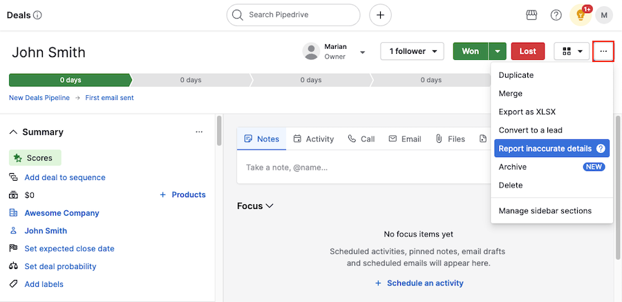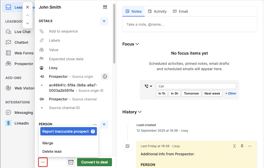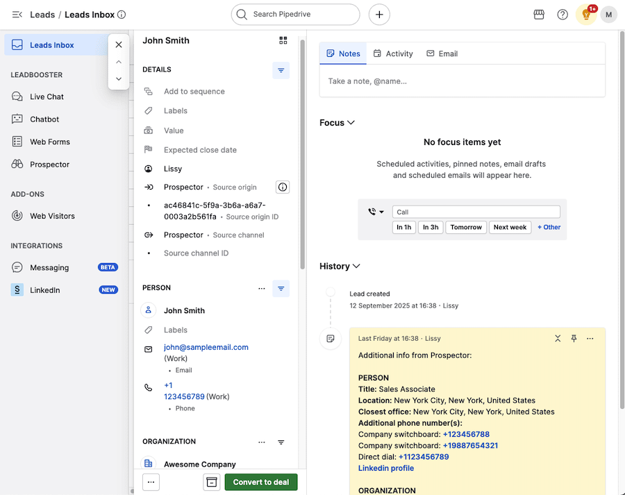 메모 섹션에는 보조 전화번호나 근무 이력 등 Pipedrive 필드에 맞지 않는 추가 정보가 포함될 수 있습니다.