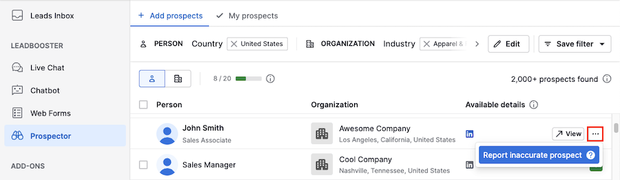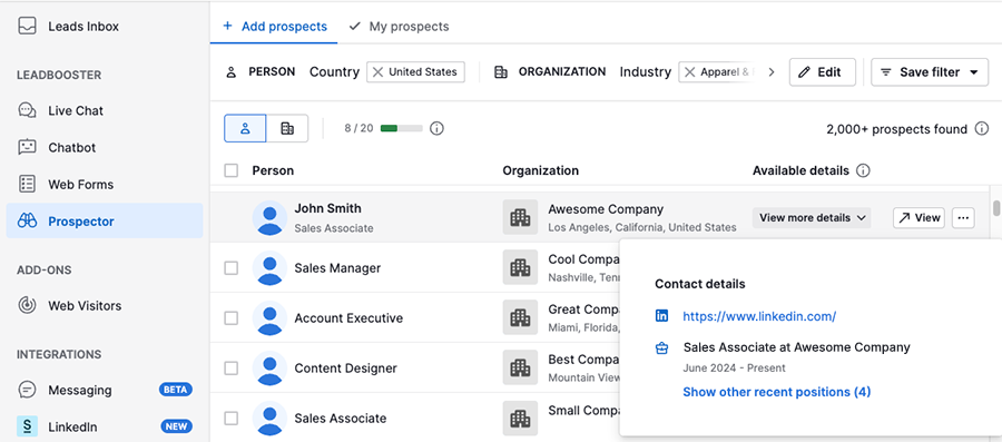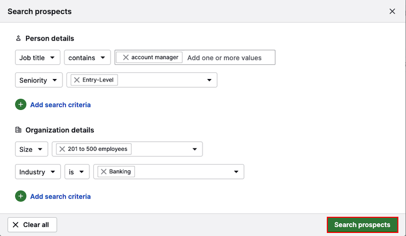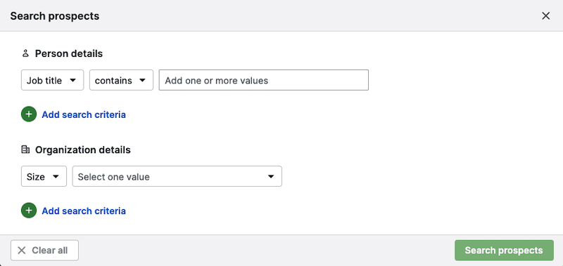 기준을 정의한 후 “Search prospects”를 클릭하세요.