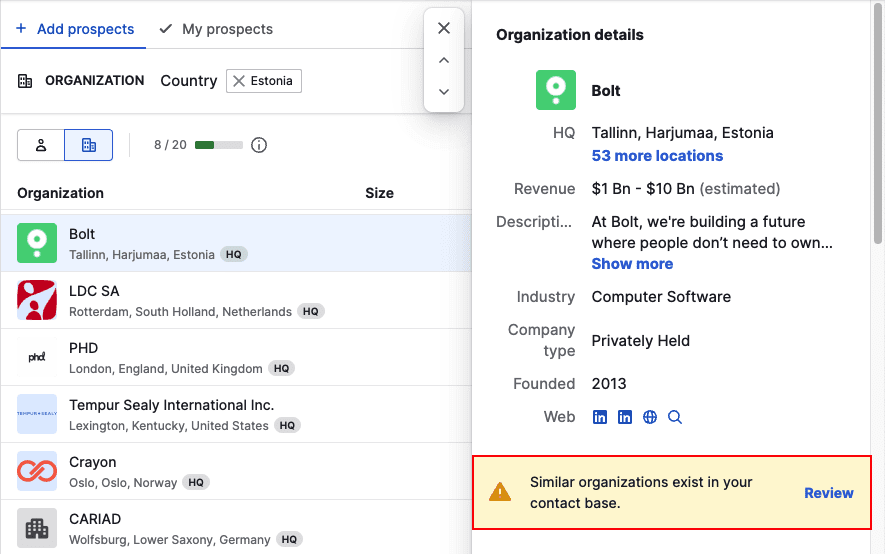 - 조직 연결 – Prospector로 리드를 추가할 때 중복 조직 생성을 방지합니다.