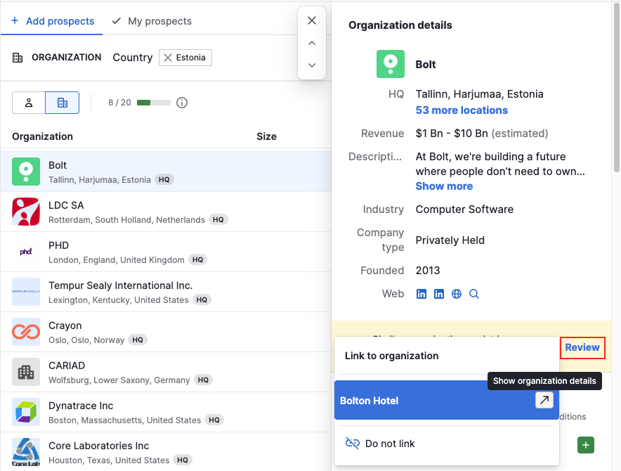 - 연결 안 함 – 조직을 분리된 상태로 유지합니다. Prospector로 리드를 추가할 때 새 조직을 생성합니다.