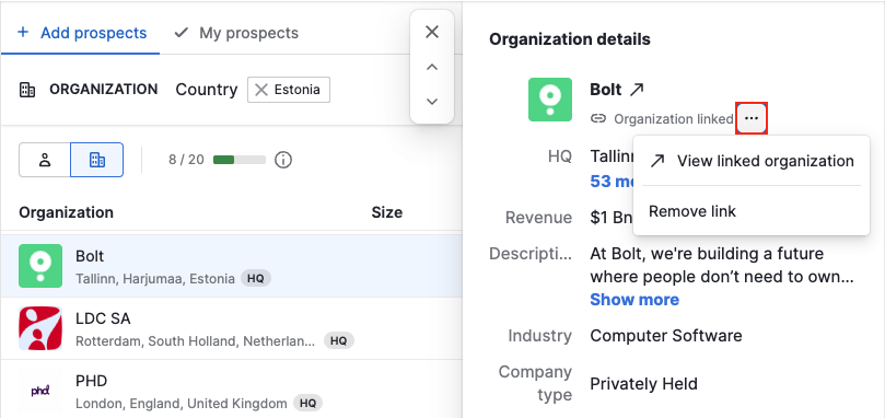 조직을 연결한 경우, 잠재 고객 옆에 있는 “...” 을 클릭하여 연결된 조직을 보거나 연결을 해제할 수 있습니다.