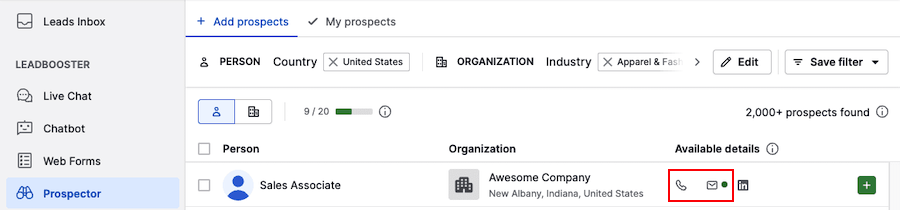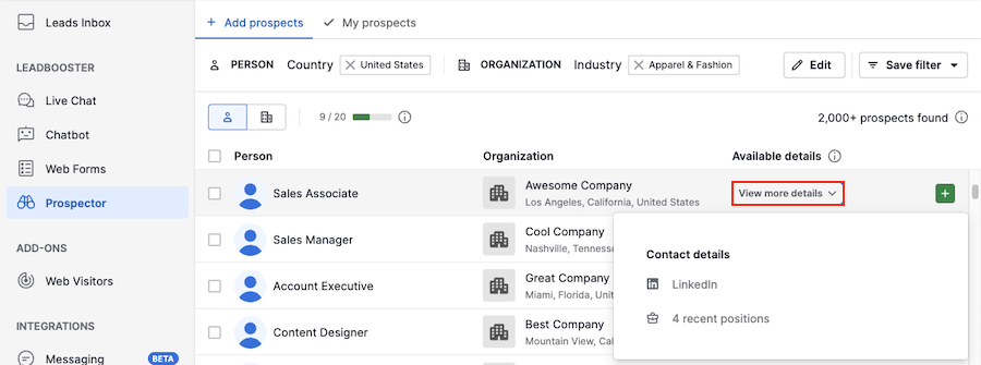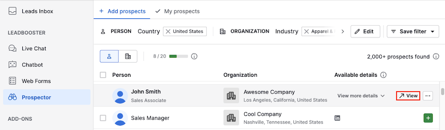 특정 필터 조건을 추가하여 잠재 고객을 검색할 수 있습니다. 이는 Pipedrive의 필터링과 유사합니다.