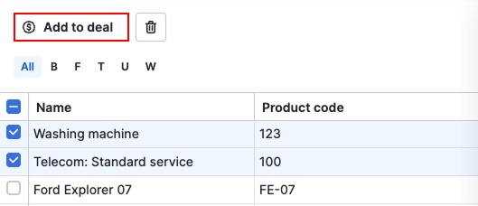 In de products lijstweergave selecteert u meerdere producten en klikt u op “Add to deal” om ze te koppelen.