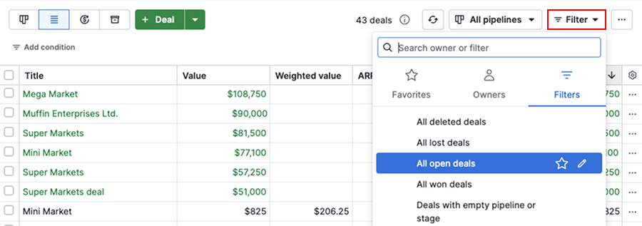 De lijstweergave is een kernmanier om gegevens in Pipedrive te beheren. Het is beschikbaar voor leads, deals, contacten, activiteiten, projecten en producten, en toont je items in een spreadsheet-achtige weergave.