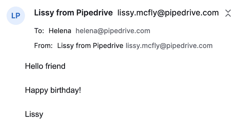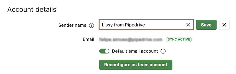 A feladó neve jelenik meg a „Feladó” mezőben, amikor a Pipedrive-ból e-maileket küldesz. Alapértelmezés szerint ez az e-mail címed (pl. [email protected]), de testre szabhatod, ha használod az e-mail szinkronizálást, hogy személyesebbnek vagy professzionálisabbnak tűnjön.