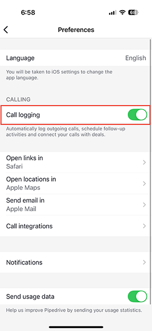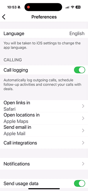 A JustCall engedélyezéséhez a Pipedrive mobilalkalmazásban koppints a „Hívásintegrációk” elemre, és kapcsold be a JustCall opciót.