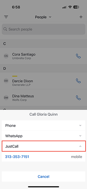 Miután a JustCall opció be van kapcsolva, hívást indíthatsz egyszerűen a kapcsolattartó telefonszámára koppintva, majd a JustCall lehetőséget kiválasztva.