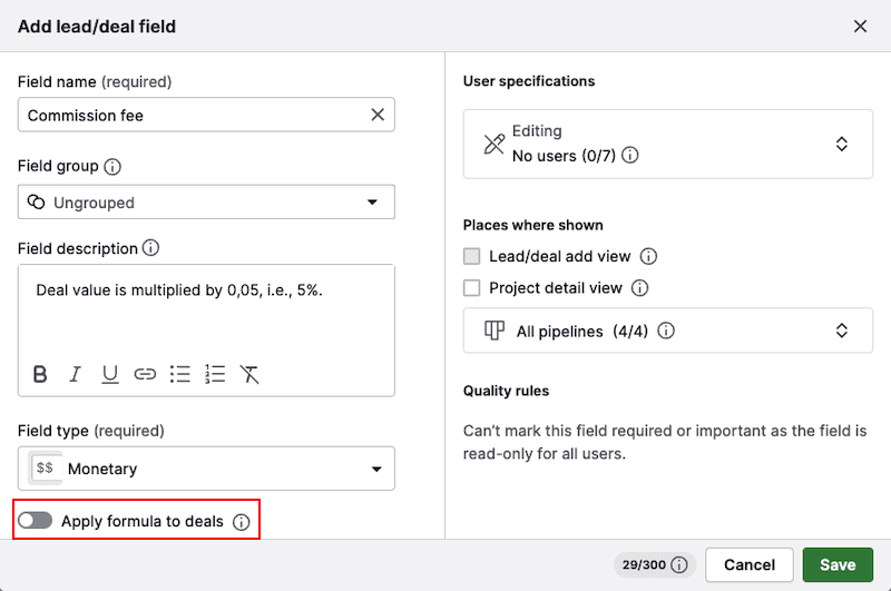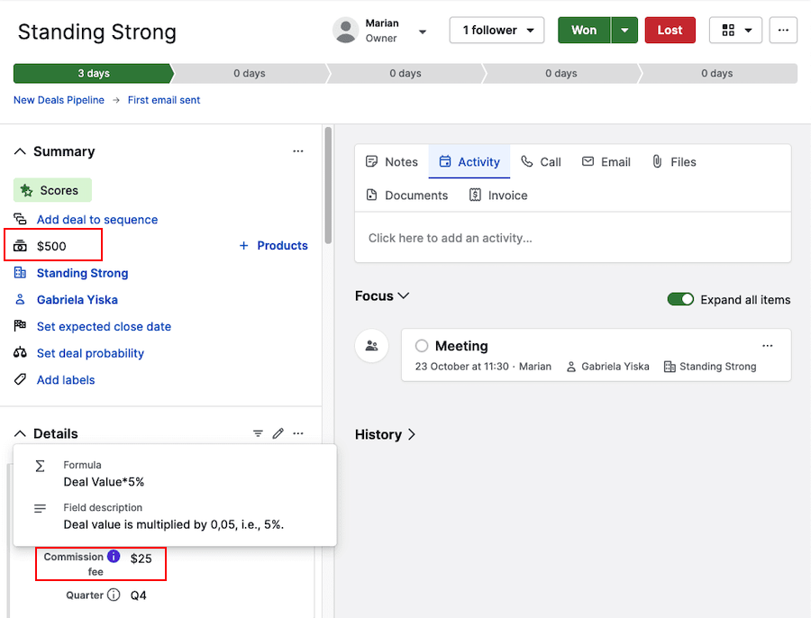 Dalam contoh di bawah, bidang formula bernama “Commission fee” hanya menggunakan nilai deal sebesar $500 sebagai input, yang kemudian dikalikan 5%.