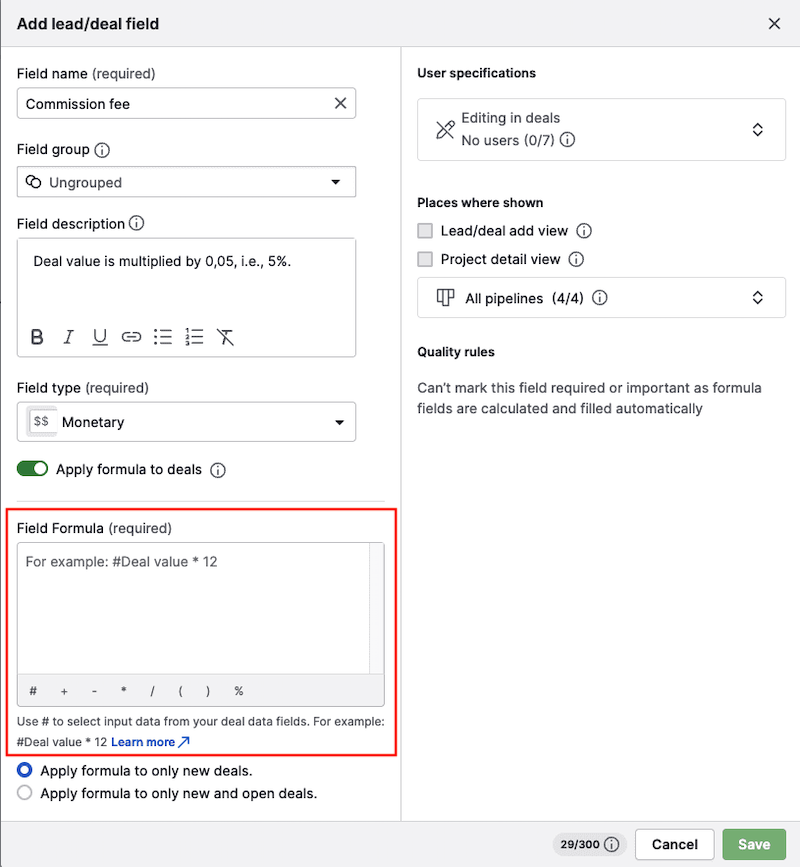 Setelah Anda menulis formula, pilih apakah formula tersebut diterapkan ke deal baru atau hanya deal baru dan terbuka.
