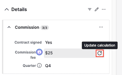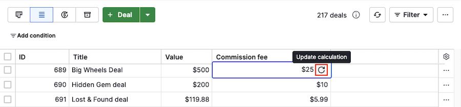Ketika sebuah deal mencakup semua bidang input yang diperlukan, formula akan dihitung secara otomatis.