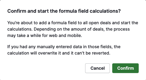 Jika Anda memilih “Terapkan formula hanya ke deal baru dan terbuka”, Anda perlu mengonfirmasi perhitungan sebelum formula diterapkan.