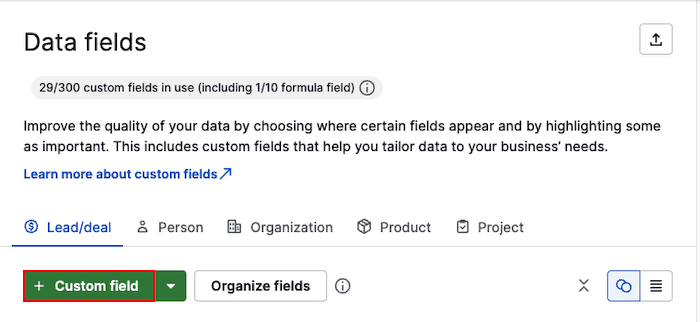 Di bagian lead/deal, klik “+ Field kustom” untuk membuat field baru.