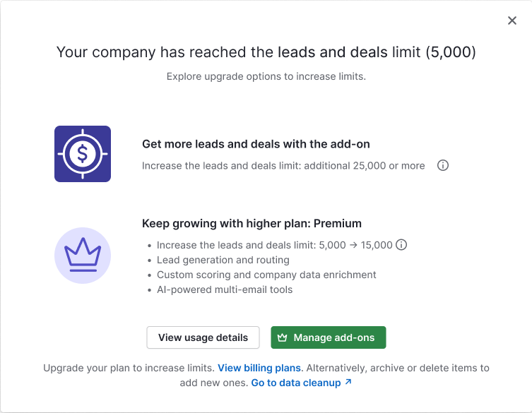 Untuk mengetahui penggunaan saat ini dan batas leads dan deals Anda, lihat informasi penagihan Anda atau menu Penggunaan di pengaturan perusahaan Anda.
