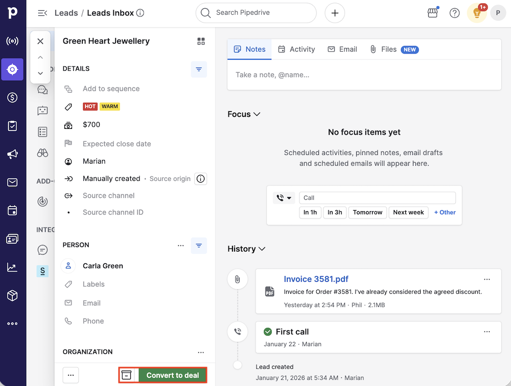 Когда вы квалифицировали лид и готовы работать с ним как со сделкой в вашей воронке, вы можете нажать «Конвертировать в сделку».