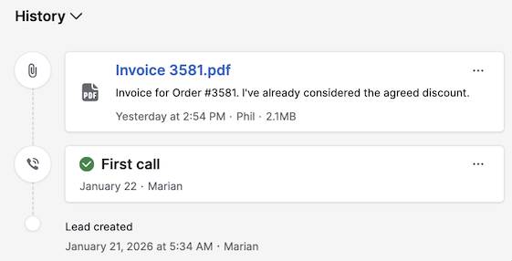 - История – В этом разделе отображаются заметки, выполненные активности, отправленные письма и загруженные файлы