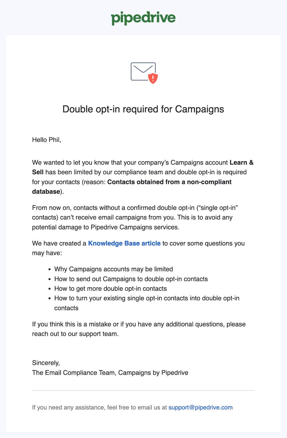 - Şirket, Pipedrive'ın gönderilen e-postaların teslimatını iyileştirme önerilerine uymadı