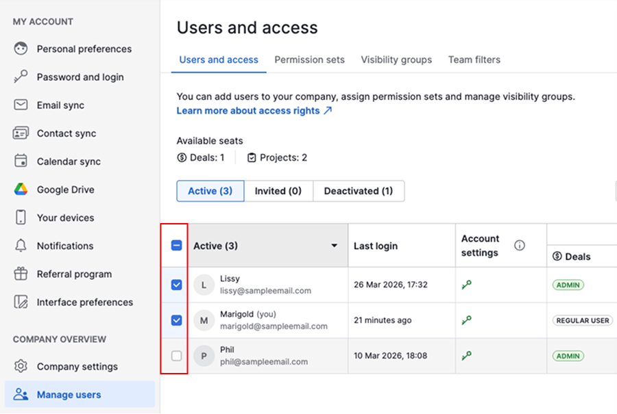 Pipedrive'in sağ üst köşesindeki hesap menüsünü açın ve Şirket Ayarları > Kullanıcıları Yönet > Kullanıcılar ve Erişim.