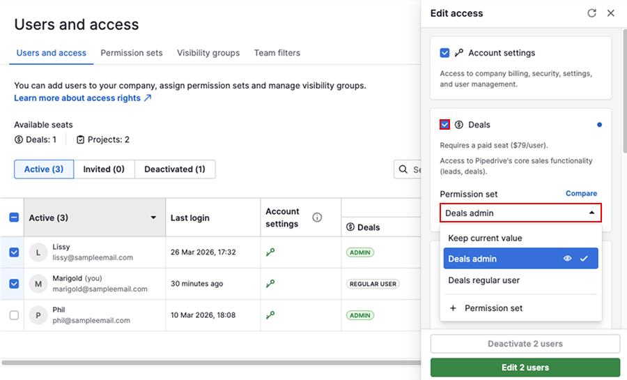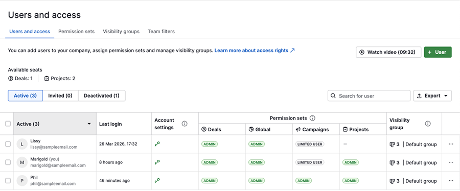 - Erişim hakları – Kullanıcıların Pipedrive'ın hangi bölümlerine erişebileceğine karar verin
