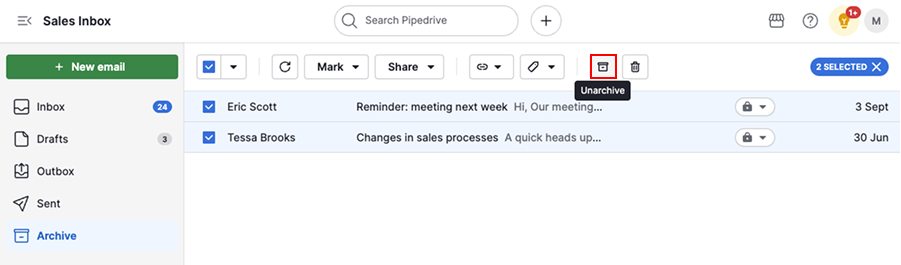 根據操作執行的位置,封存與刪除可能會同時影響 Pipedrive 與您已連線的郵件用戶端。