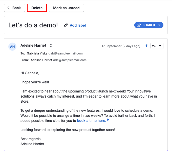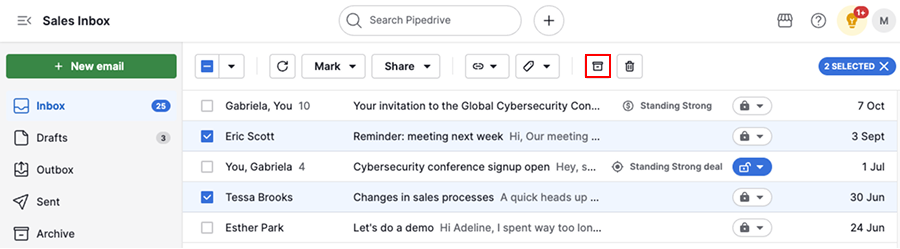 保持您的 銷售收件匣 井然有序,能幫助您專注於最重要的對話。要處理較舊或不太相關的電子郵件,您可以選擇將其 封存 或 刪除。