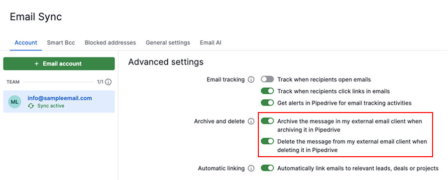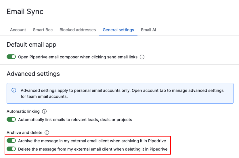 若要在 Pipedrive 中執行封存或刪除時也在外部郵件用戶端套用,請啟用下列選項: