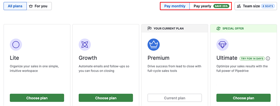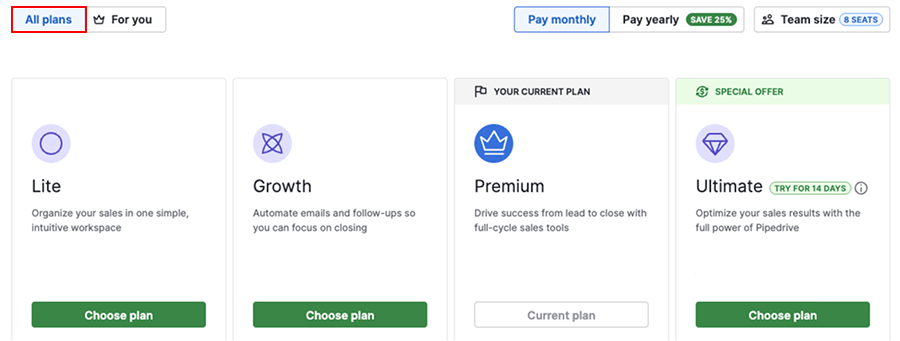 Pipedrive 提供四種訂閱方案,適合各種規模的團隊:Lite、Growth、Premium 及 Ultimate。您還可以透過選購 加購項目 和 加值包 來進一步客製化您的訂閱。