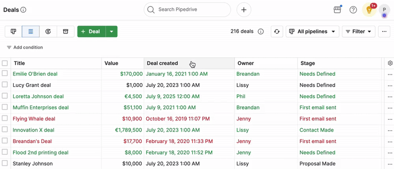 在 Pipedrive 中,若要依多個欄位排序: